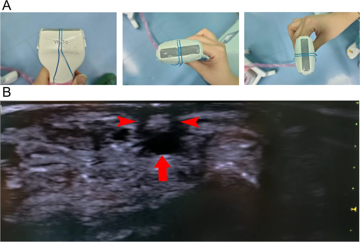 超音波プローブに長軸に垂直に二重展開線を結んでいる。A 二重現像線用超音波プローブの設計。B 橈骨動脈(矢印)の超音波画像と二重展開線(矢頭)の音響影像