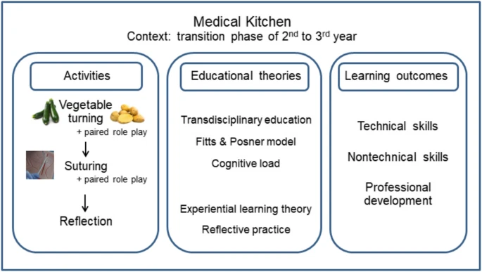 このコースは、料理技術と臨床技術を統合したトランスディシプリナリー(学際的)教育アプローチを採用している。具体的には、野菜のターニング(装飾切り)とシリコンモデルでの縫合練習という2つの主要活動で構成されている。