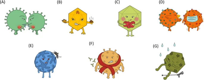 *A: EBウイルス。 B: A型肝炎ウイルス。 C: パルボウイルスB19。D: インフルエンザウイルス。E: デングウイルス。F: ヒト免疫不全ウイルス。G: エンテロウイルスウイルス